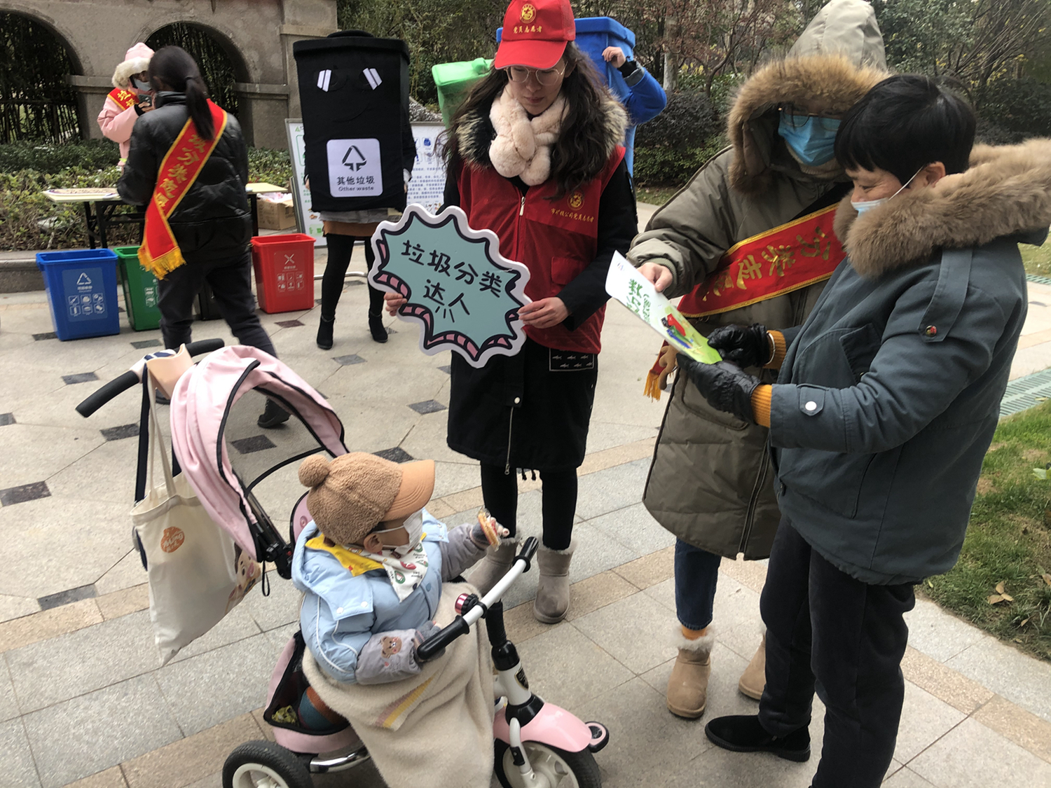 活動中,志愿者們身穿“可回收物”、“廚余垃圾”、“有害垃圾”、“其他垃圾”四色玩偶服,通過向居民發(fā)放宣傳單頁、開展“垃圾分分樂”、“垃圾分類跳棋”游戲等方式,向其宣傳垃圾分類相關(guān)知識。活動現(xiàn)場氣氛火熱,社區(qū)居民不畏嚴(yán)寒,紛紛從家中拿出廢舊電池、舊水銀溫度計(jì)等有害垃圾換取垃圾袋。