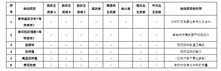 (6)招標(biāo)范圍及內(nèi)容:對(duì)諭興礦礦區(qū)南側(cè)+5m以上8種玄武巖原石檢測(cè)(檢測(cè)項(xiàng)目具體如下表)。檢測(cè)成果需滿足國家法律法規(guī)、行業(yè)檢測(cè)標(biāo)準(zhǔn),提供技術(shù)咨詢服務(wù)與集料破碎。