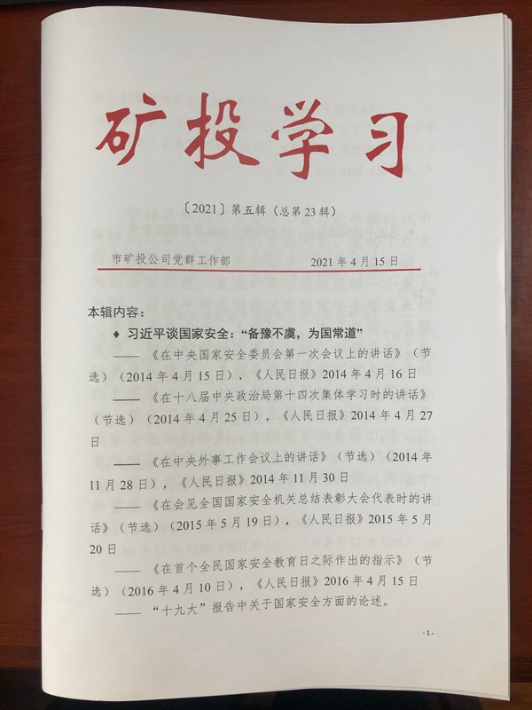 2021年4月15日是第六個(gè)全民國(guó)家安全教育日。為深入學(xué)習(xí)貫徹習(xí)近平總書(shū)記關(guān)于總體國(guó)家安全觀的重要論述精神,提高公司全體職工安全文明素養(yǎng),市礦投公司多渠道組織開(kāi)展系列宣傳教育活動(dòng)。