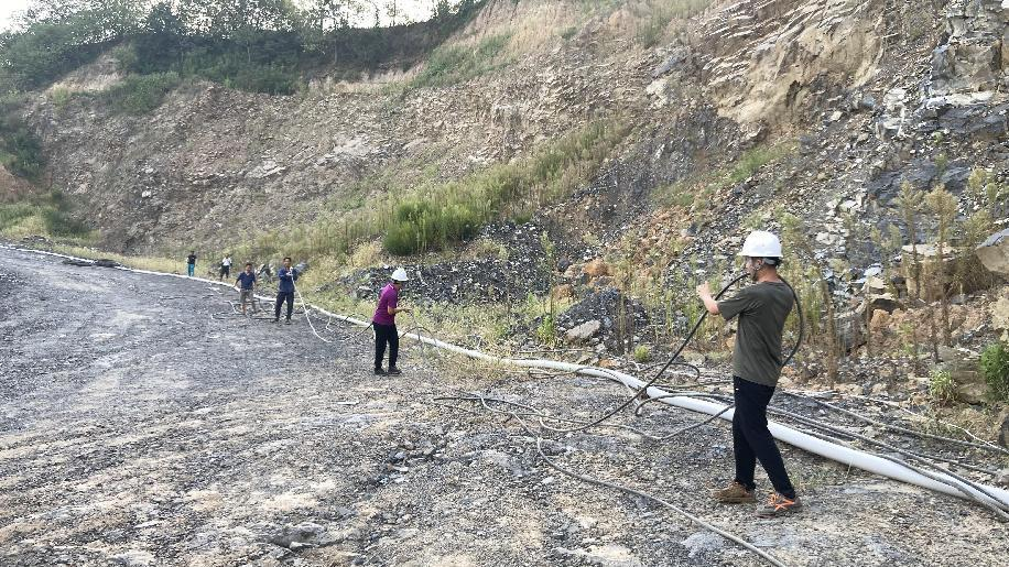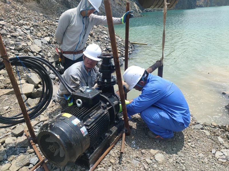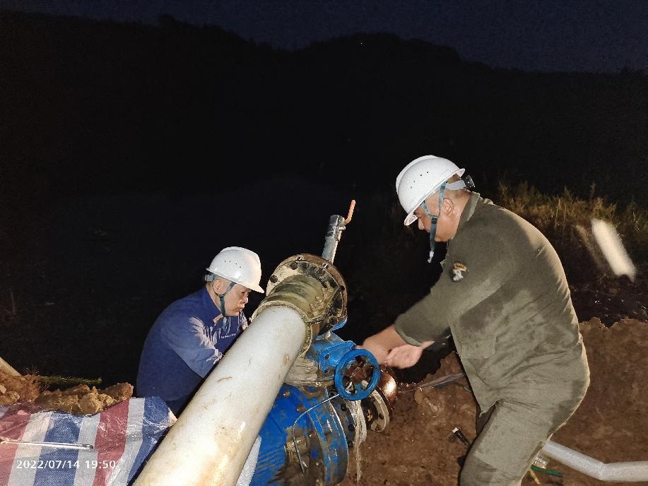 抗旱方案有了,可是要想把水從70米深的礦坑內(nèi)抽到地面,不但需要揚程特別高的水泵,還需要高規(guī)格長距離的水管和電纜,還有很多配套零部件要采購。旱情就是命令,抗旱就是責任,興天礦業(yè)副總經(jīng)理趙崗牽頭落實抗旱物資采購,親自指揮設(shè)備調(diào)運安裝,帶領(lǐng)公司抗旱突擊隊和社區(qū)干部深入礦坑,一起研究水泵需要多大功率安裝在什么地方、水管需要多粗從哪里下放、電纜需要多長從哪里接電等問題。方案制定好了,老百姓的水稻不能等,挖掘機第一時間進場整理場地,興天礦業(yè)和社區(qū)準備的水泵、水管電纜等也迅速到位,抗旱突擊隊與社區(qū)干部群眾一起與時間賽跑,從早到晚緊張施工,一心想著的就是早點把水抽上去,盡量把旱情影響降到最低。