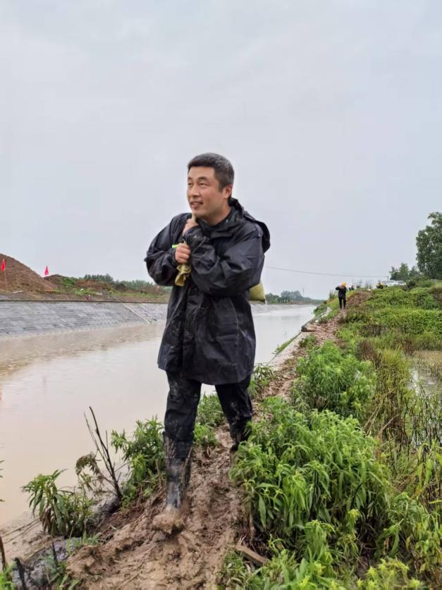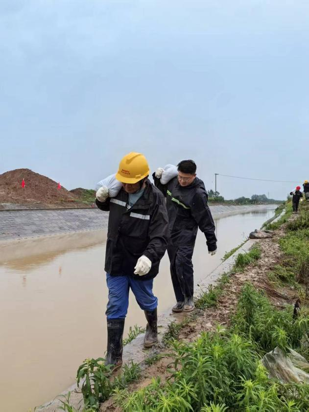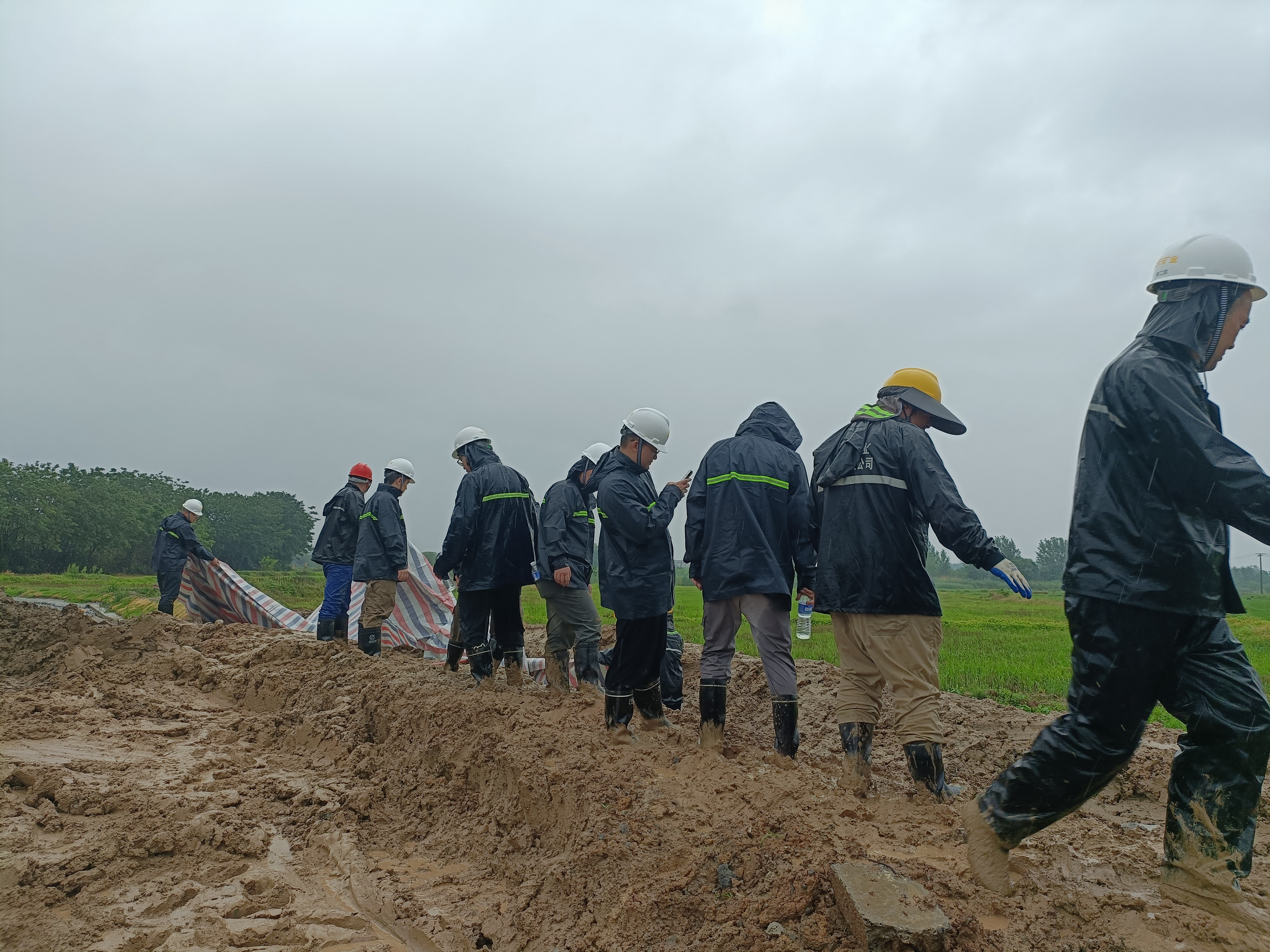 搶險現(xiàn)場,黨員干部帶頭扛起沙袋,跳入泥水中加固堤壩。由于河道水位上漲較快,突擊隊員手持鐵鍬開挖臨時導(dǎo)流渠,將洪水安全引入下游官橋水庫。晝夜風(fēng)雨里泥水滿身,抗洪搶險中責(zé)任在肩,沙袋和鐵鍬磨破了隊員們的雙手,卻磨不滅他們的意志,經(jīng)過兩天連續(xù)作戰(zhàn),最終成功排除險情。
